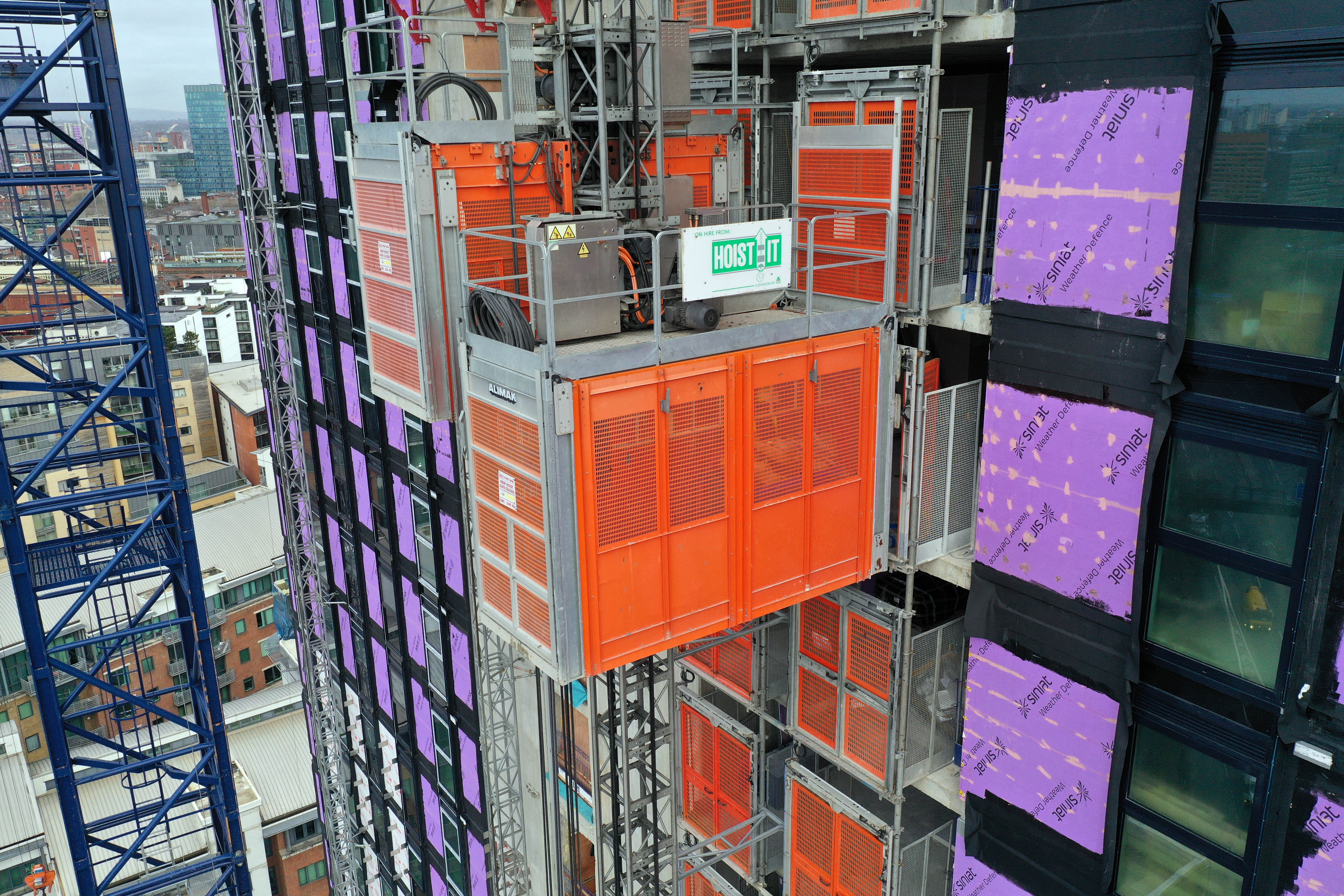 The hoist mast height is extended either by using a ‘self-erect’ jib and winch or using a site tower crane, reducing working at height.
